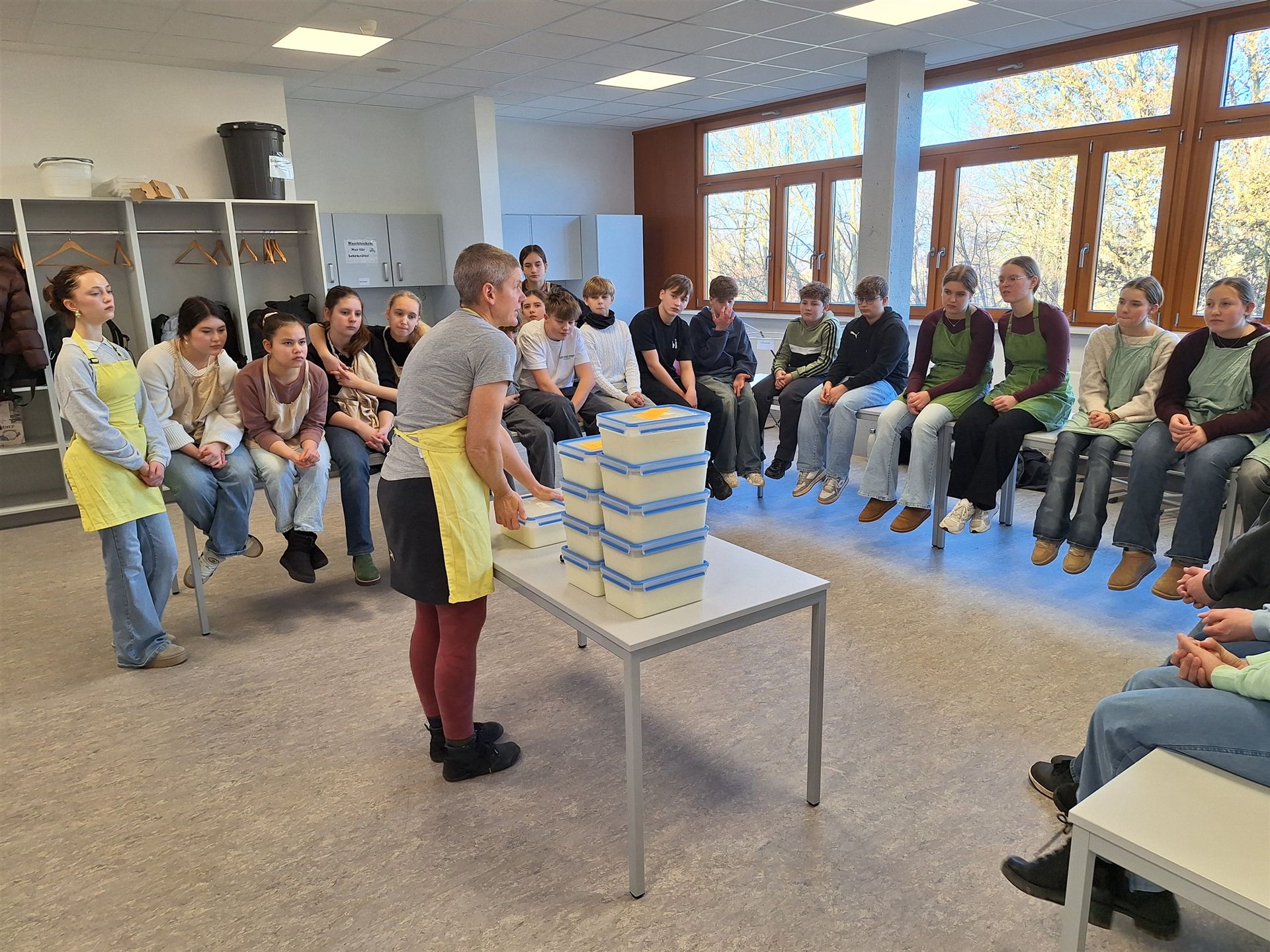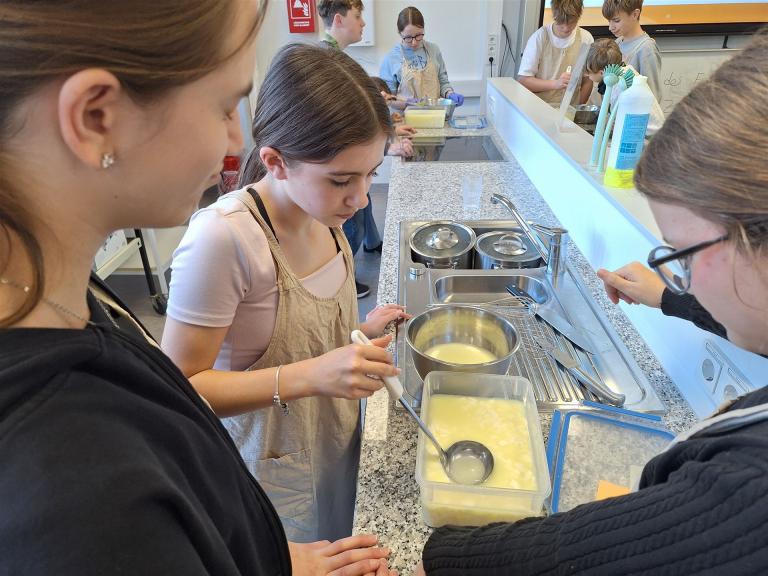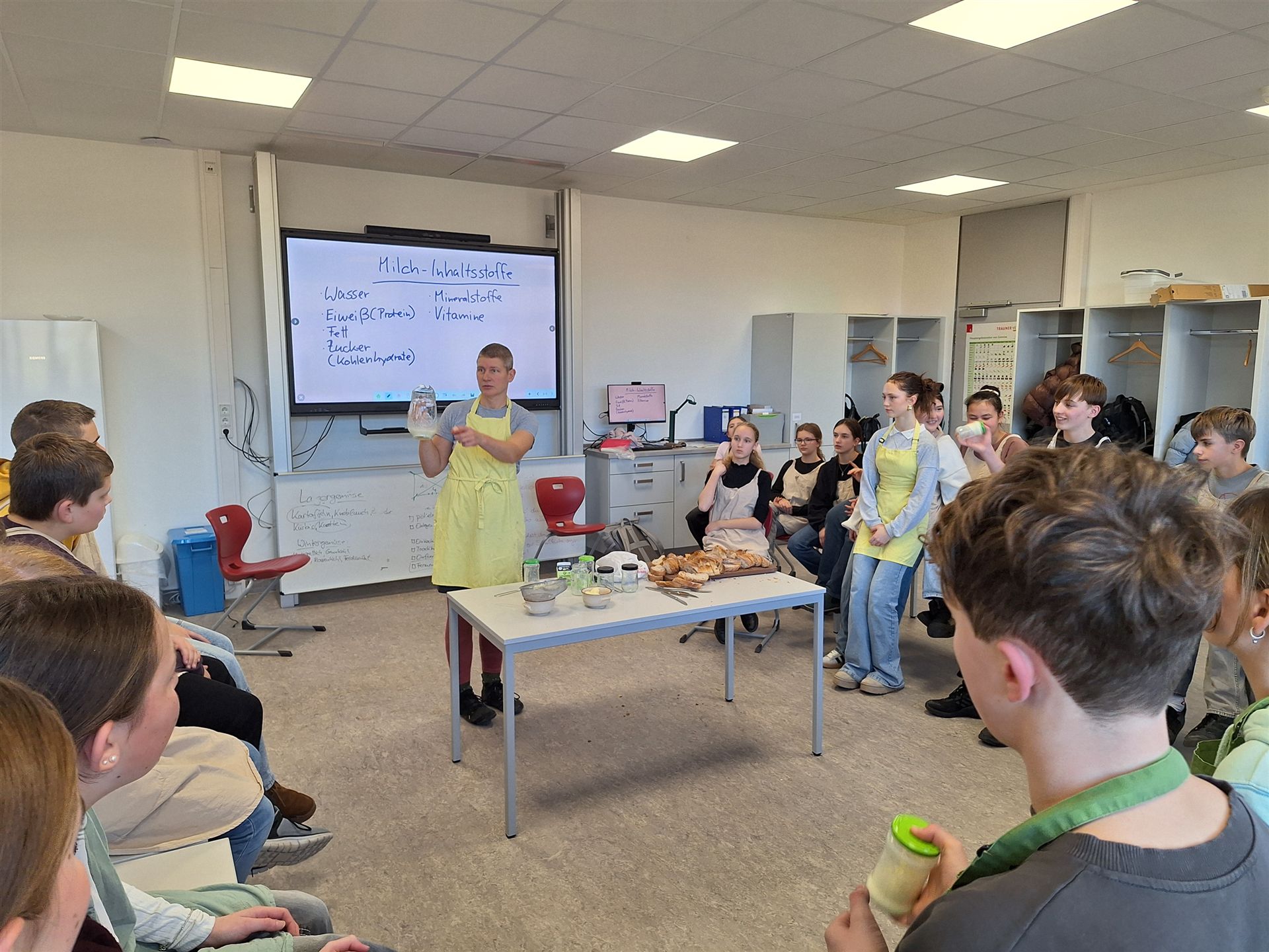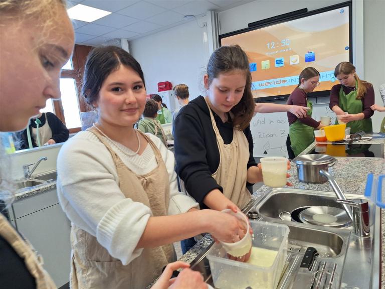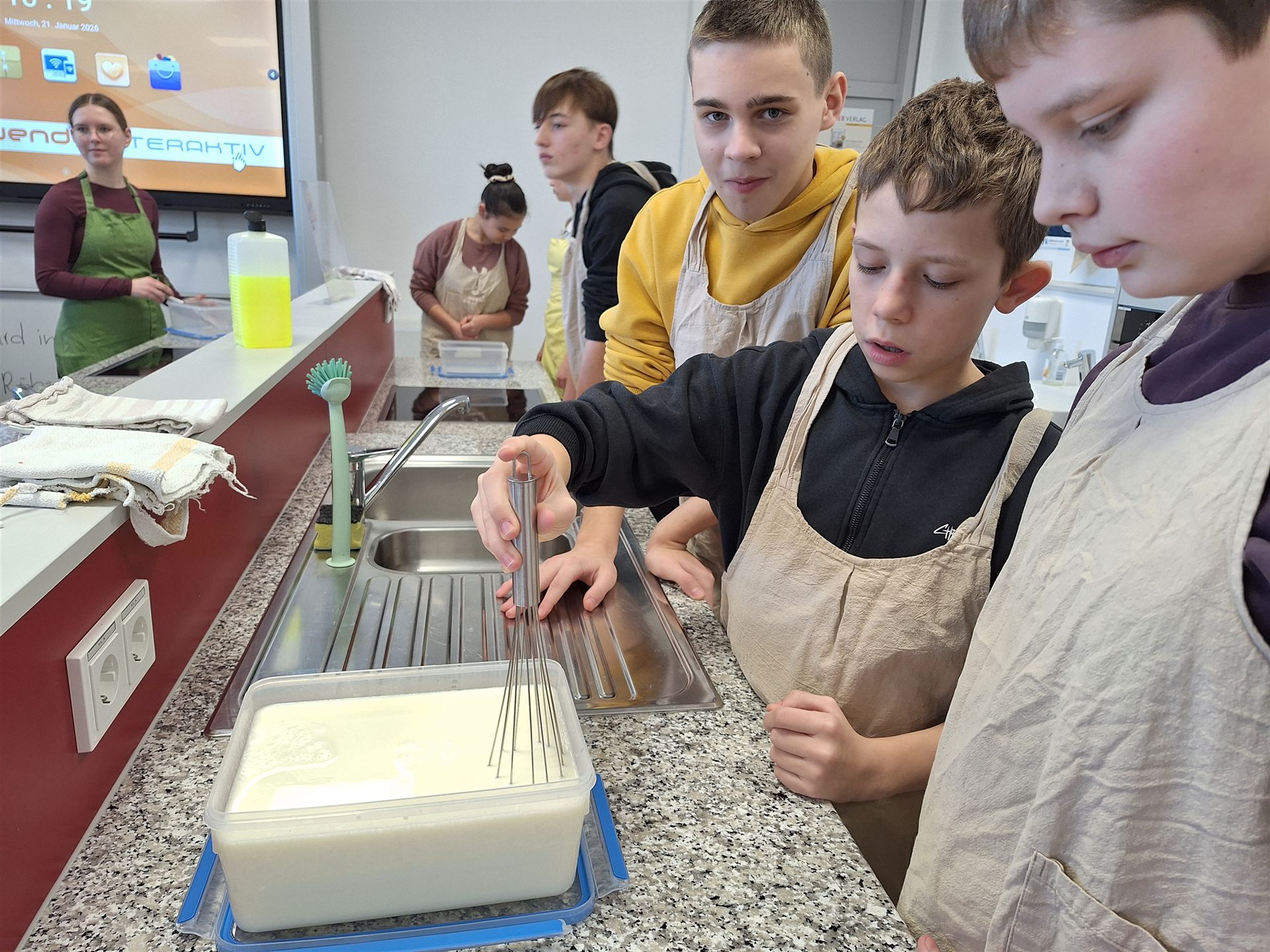 In einem spannenden Projekt haben wir an der KGS selbst Käse hergestellt. Die Pädagogen vom Lämmerhof aus Landolfshausen führten uns in der Schulküche durch das Thema Milch. Wir verwendeten regionale Bio-Milch aus der Region aus Diemarden. Wir lernten, woraus Milch besteht, und stellten daraus Butter, Buttermilch, Molke und schließlich Käse her. Mit echtem Lab aus dem Kälbermagen verwandelten wir das Milchprotein in Käse. Anschließend lagerte der Käse, sodass jeder Schüler am Ende ein Stück mitnehmen konnte. Die Begeisterung war riesig – die Schüler hatten Spaß, arbeiteten praktisch und lernten viel über den Käseprozess. Im Anschluss setzen wir uns damit auseinander, wie Milch in großen Mengen produziert wird, wie dies funktioniert und wie es den Tieren dabei geht. Außerdem beleuchten wir, wie die industrielle Milchproduktion abläuft und welche wirtschaftlichen Bedingungen dahinterstehen. Dieses Erlebnis hat den Wert von Lebensmitteln und nachhaltigem Wirtschaften praktisch vermittelt.