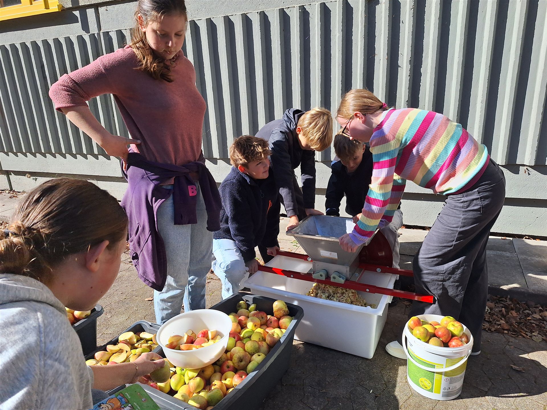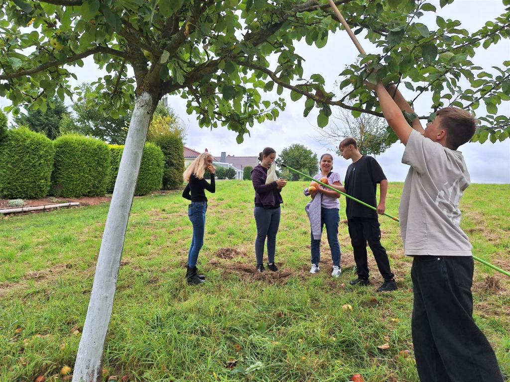 Im Profilkurs BNE „Bildung für nachhaltige Entwicklung“ (8. Jahrgang) wurde ein Projekt zum Thema Apfelsaft aus regionalen Äpfeln durchgeführt, bei dem eigener Apfelsaft gepresst und Apfelkuchen gebacken wurde. Dafür sammelten die Schülerinnen und Schüler Äpfel auf der Streuobstwiese in Gieboldehausen und brachten zusätzlich Obst von zu Hause mit. Im Unterricht setzten sie sich mit dem Wert regionaler Lebensmittel und der Bedeutung von Streuobstwiesen für die Artenvielfalt auseinander. Dabei wurden ökologische, gesundheitliche und wirtschaftliche Vorteile regionaler Obstsorten thematisiert. Auf der Exkursion lernten die Schülerinnen und Schüler außerdem heimische Pflanzenarten sowie den Anbau verschiedener Getreidesorten kennen.