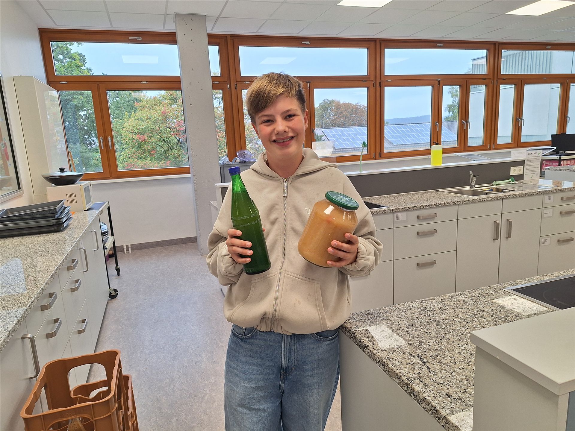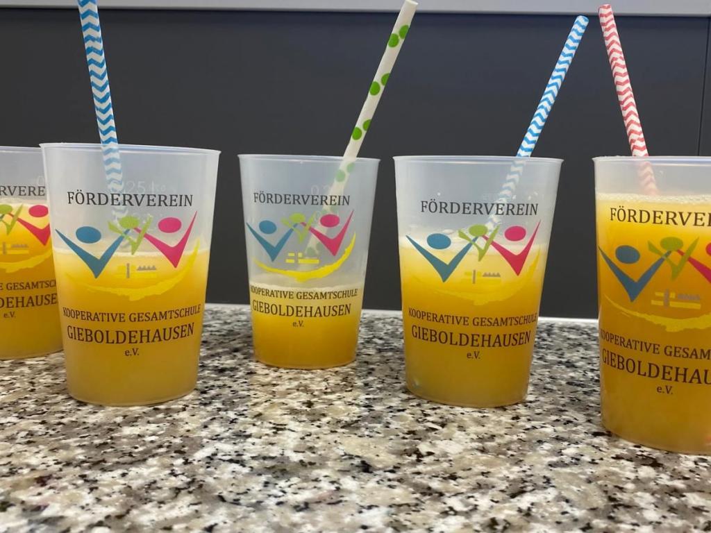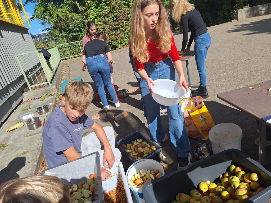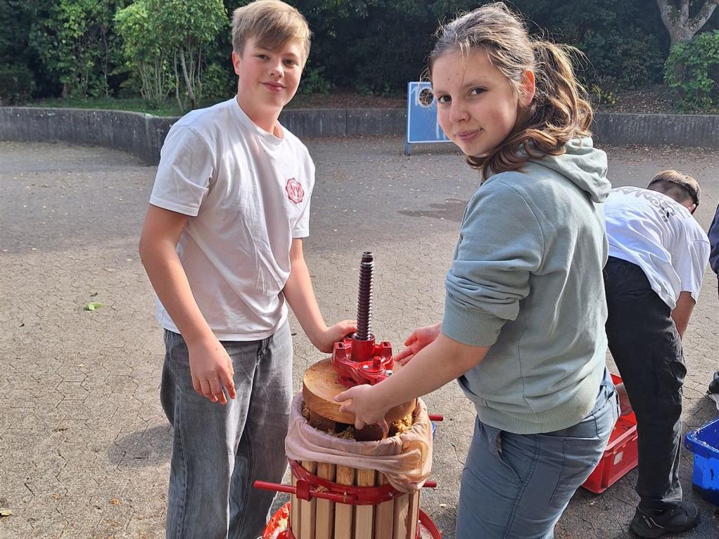 Die gesammelten Äpfel wurden anschließend mit einer Apfelpresse verarbeitet und der Saft in der Schulküche haltbar gemacht. Dabei wurde der Kurs vom WPK For Future aus Jahrgang 7 unterstützt. Beim anschließenden Pausenverkauf konnte der selbst hergestellte Apfelsaft von der Schulgemeinschaft verkostet werden. In diesem Rahmen stellte der Förderverein neue Mehrwegbecher zur Verfügung, die speziell für Schulveranstaltungen angeschafft wurden. Ziel ist es, künftig auf Einwegbecher zu verzichten und Müll zu vermeiden. Die Mehrwegbecher wurden vom Förderverein finanziert, mit dem Schullogo versehen und werden sehr gerne genutzt. Das Projekt verband praktisches Arbeiten mit nachhaltigem Lernen und zeigte, wie Umweltschutz im Schulalltag konkret umgesetzt werden kann.