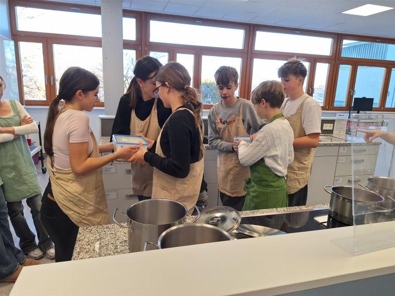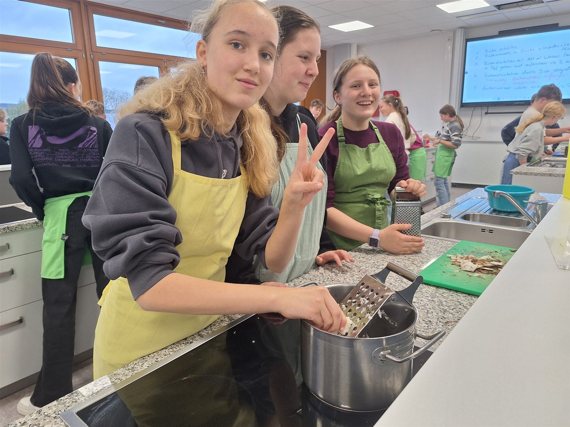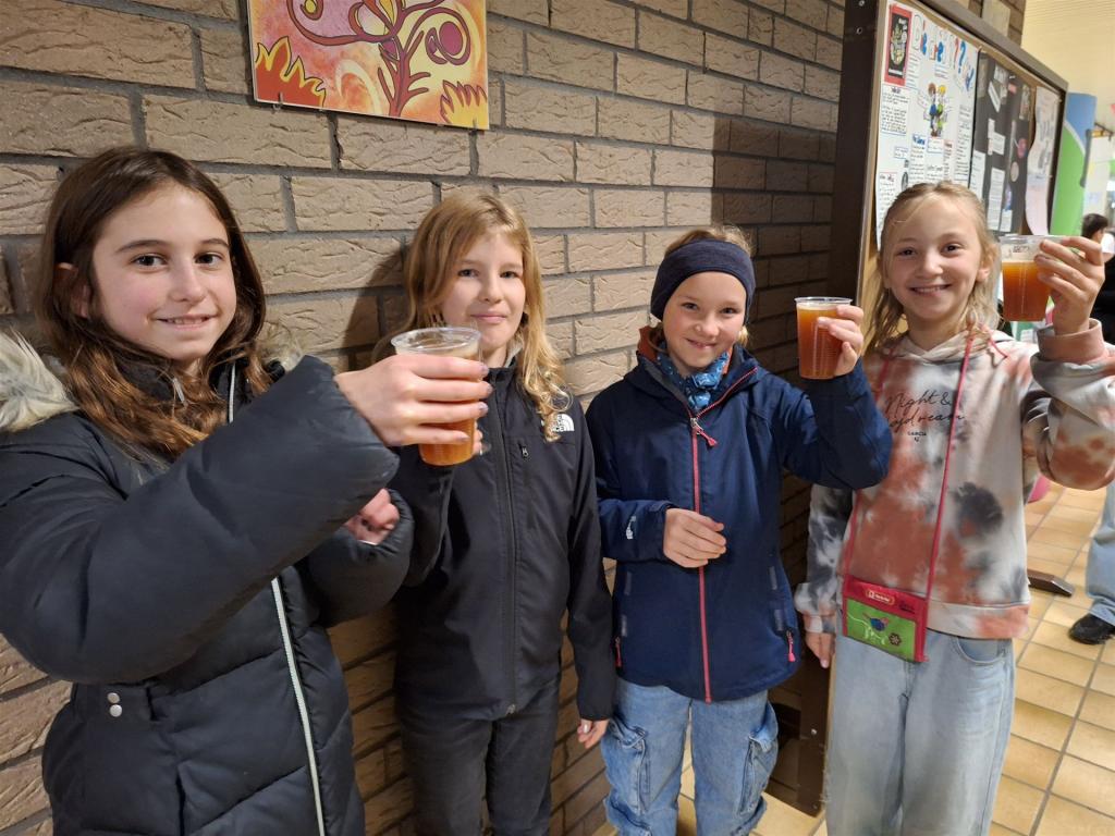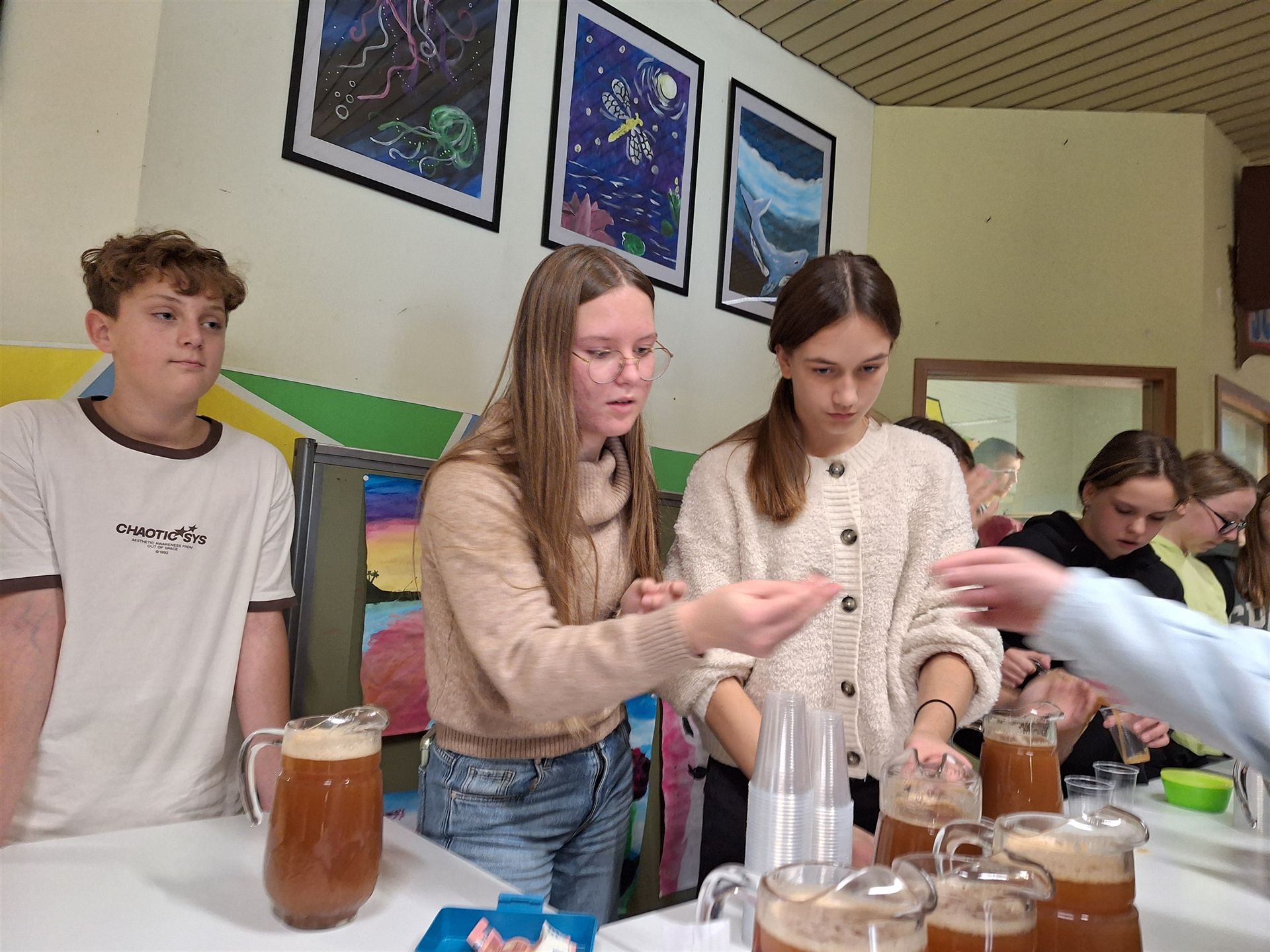 Die gesammelten Äpfel wurden anschließend mit einer Apfelpresse verarbeitet und der Saft in der Schulküche haltbar gemacht. Dabei wurde der Kurs vom WPK For Future aus Jahrgang 7 unterstützt. Beim anschließenden Pausenverkauf konnte der selbst hergestellte Apfelsaft von der Schulgemeinschaft verkostet werden. In diesem Rahmen stellte der Förderverein neue Mehrwegbecher zur Verfügung, die speziell für Schulveranstaltungen angeschafft wurden. Ziel ist es, künftig auf Einwegbecher zu verzichten und Müll zu vermeiden. Die Mehrwegbecher wurden vom Förderverein finanziert, mit dem Schullogo versehen und werden sehr gerne genutzt. Das Projekt verband praktisches Arbeiten mit nachhaltigem Lernen und zeigte, wie Umweltschutz im Schulalltag konkret umgesetzt werden kann.