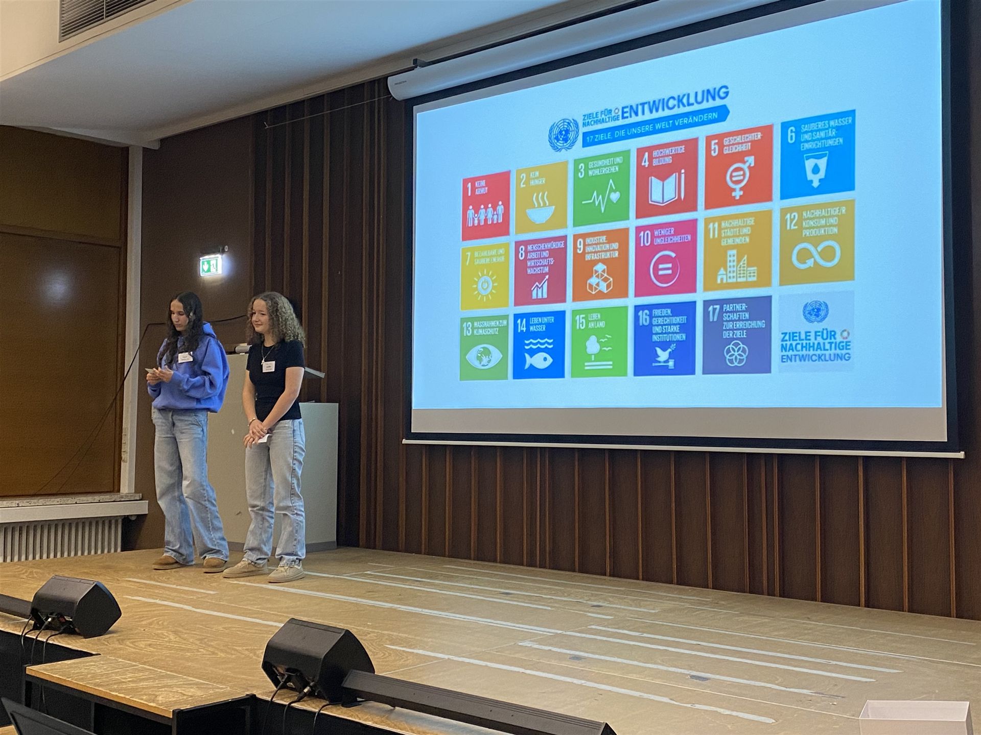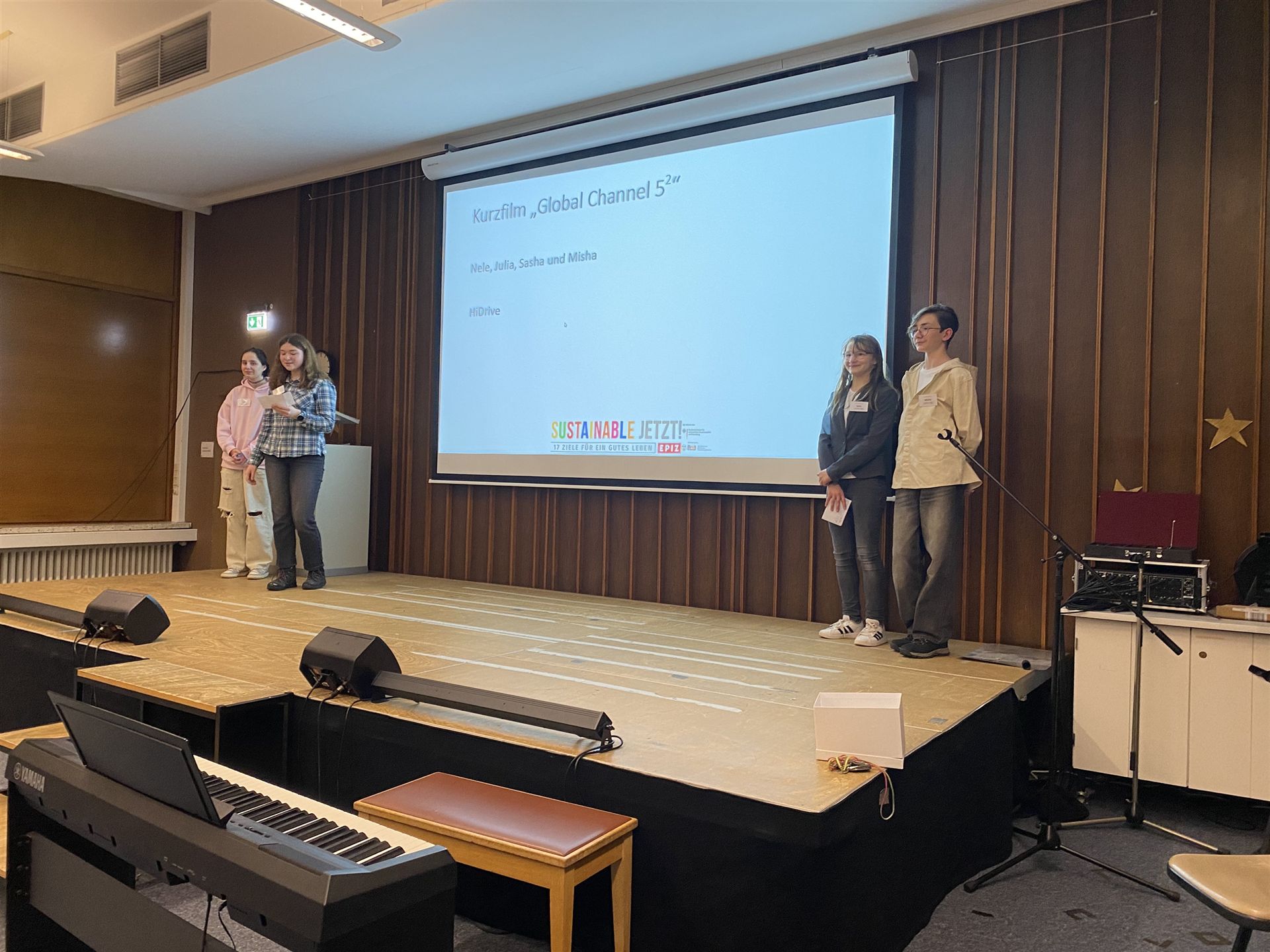 Beim diesjährigen Profilabend präsentierte die Klasse 9G1 eindrucksvoll die Ergebnisse ihrer Arbeit aus dem BNE-Unterricht. Im Mittelpunkt standen vier selbst produzierte Kurzfilme, die sich inhaltlich mit den Sustainable Development Goals (SDGs) beschäftigten und die Frage stellten, wie ein gutes Leben für alle weltweit gelingen kann. Die Filme wurden mit professionellem Equipment vorbereitet, gefilmt und geschnitten. Unterstützt wurden die Schülerinnen und Schüler dabei sowohl von Inhaltsprofis als auch von Filmprofis, die sie während des gesamten Produktionsprozesses begleiteten. Die fertigen Kurzfilme wurden in der Aula präsentiert und stießen beim Publikum auf großes Interesse. Im Anschluss moderierten die Neuntklässlerinnen und Neuntklässler souverän eine Diskussionsrunde mit dem Publikum, in der Inhalte, Botschaften und globale Zusammenhänge gemeinsam reflektiert wurden.