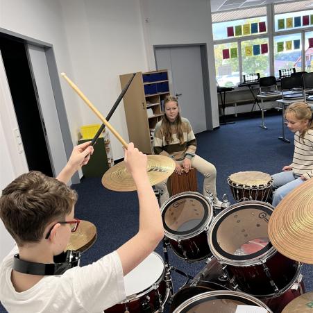 Das Fach Musik ist jedem schon aus der Grundschule bekannt. In der KGS baust du an vielen weiteren Instrumenten, wie Keyboards, Boomwackern, Stabspielen, Gitarren und Schlagzeugen deine musikalischen Fähigkeiten aus. Unsere beiden Musikräumen haben die modernsten digitale Tafeln und Bildschirme zum Schreiben und Präsentieren. Für Präsentationen und große Veranstaltungen, wie die Einschulungen, Zeugnisausgaben, Konzerte und Aufführen nutzen wir die Aula mit unserer Bühne und neusten Beschallungstechnik.