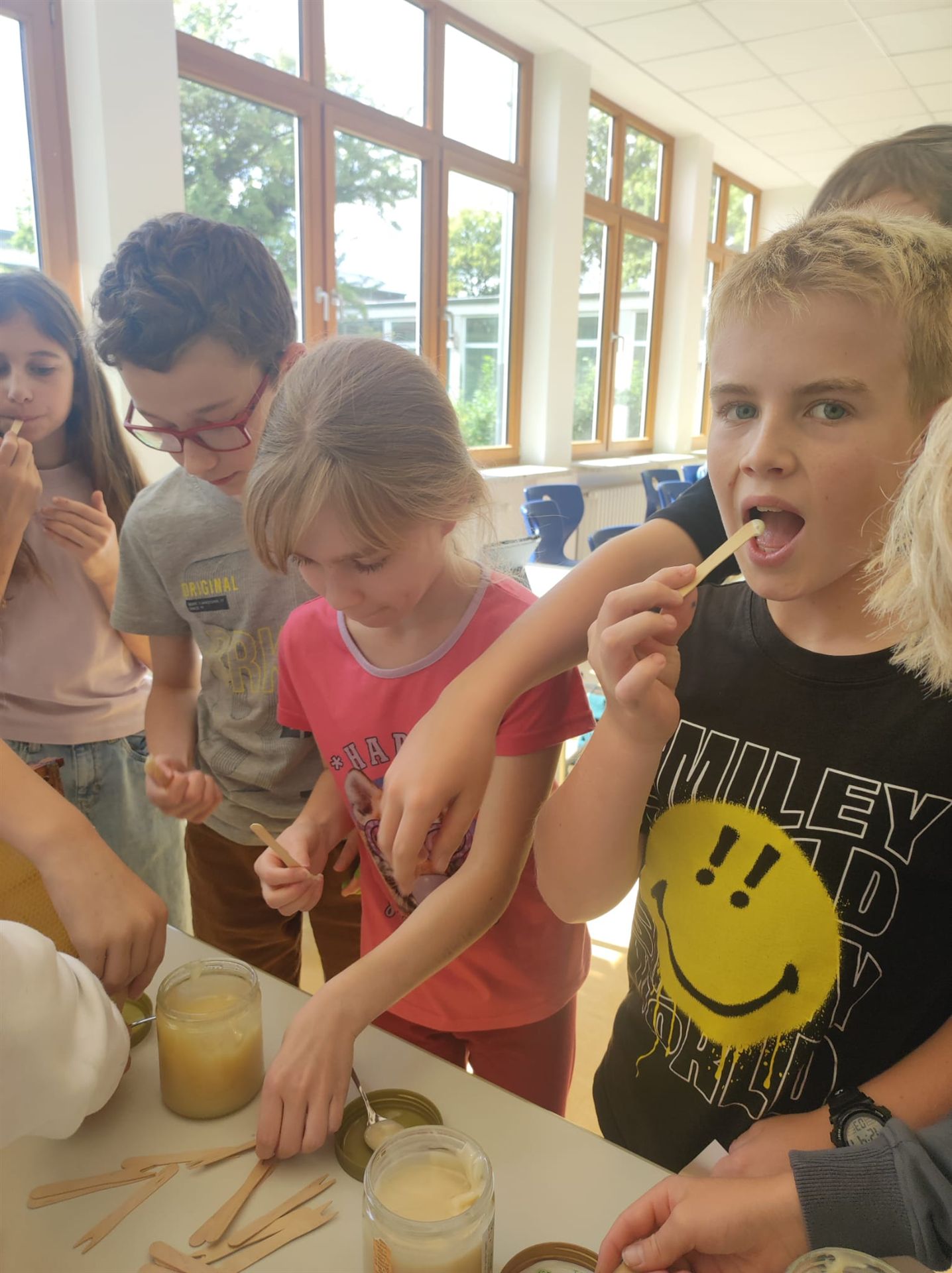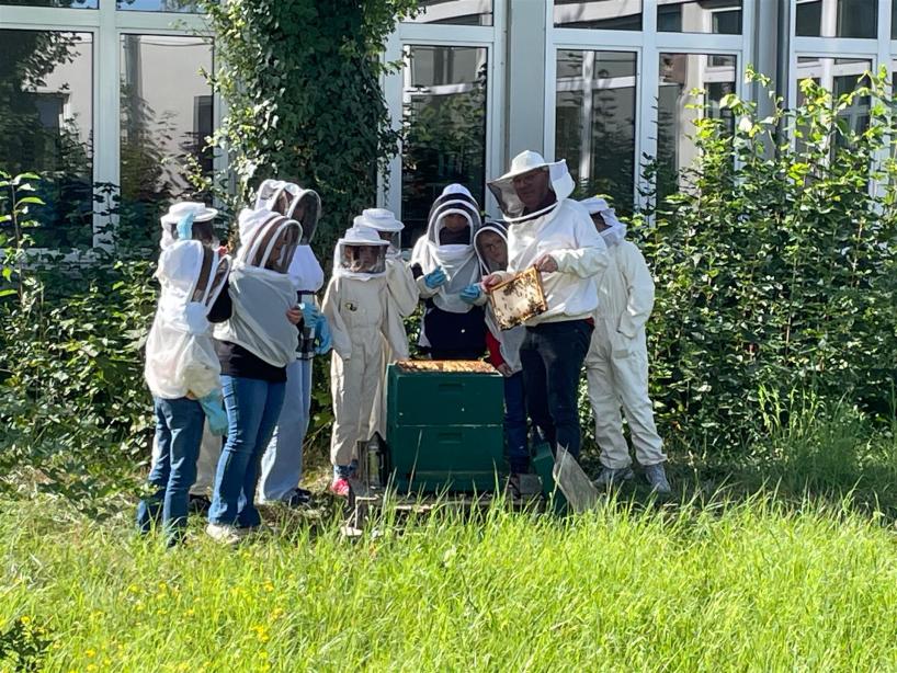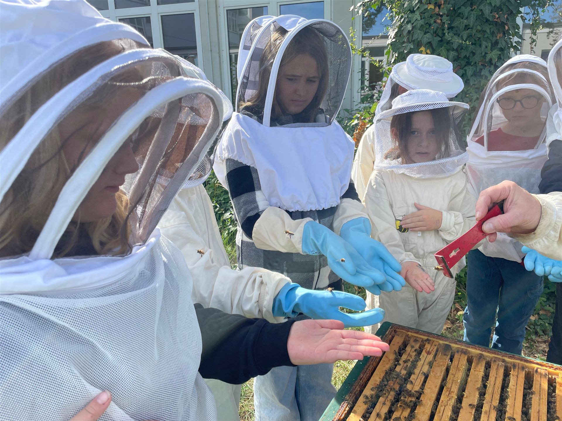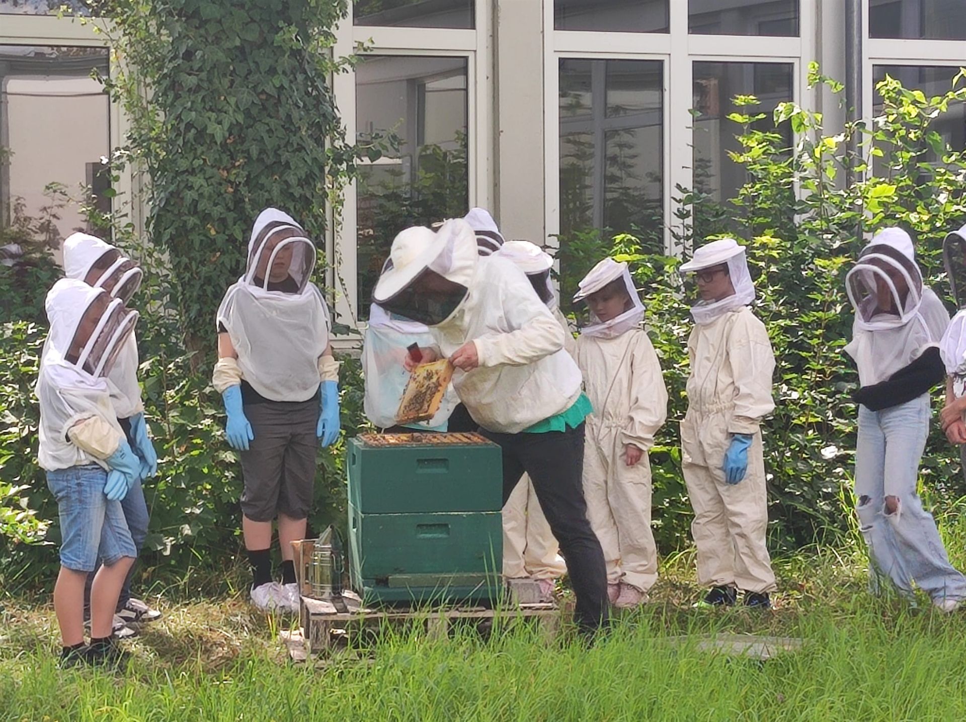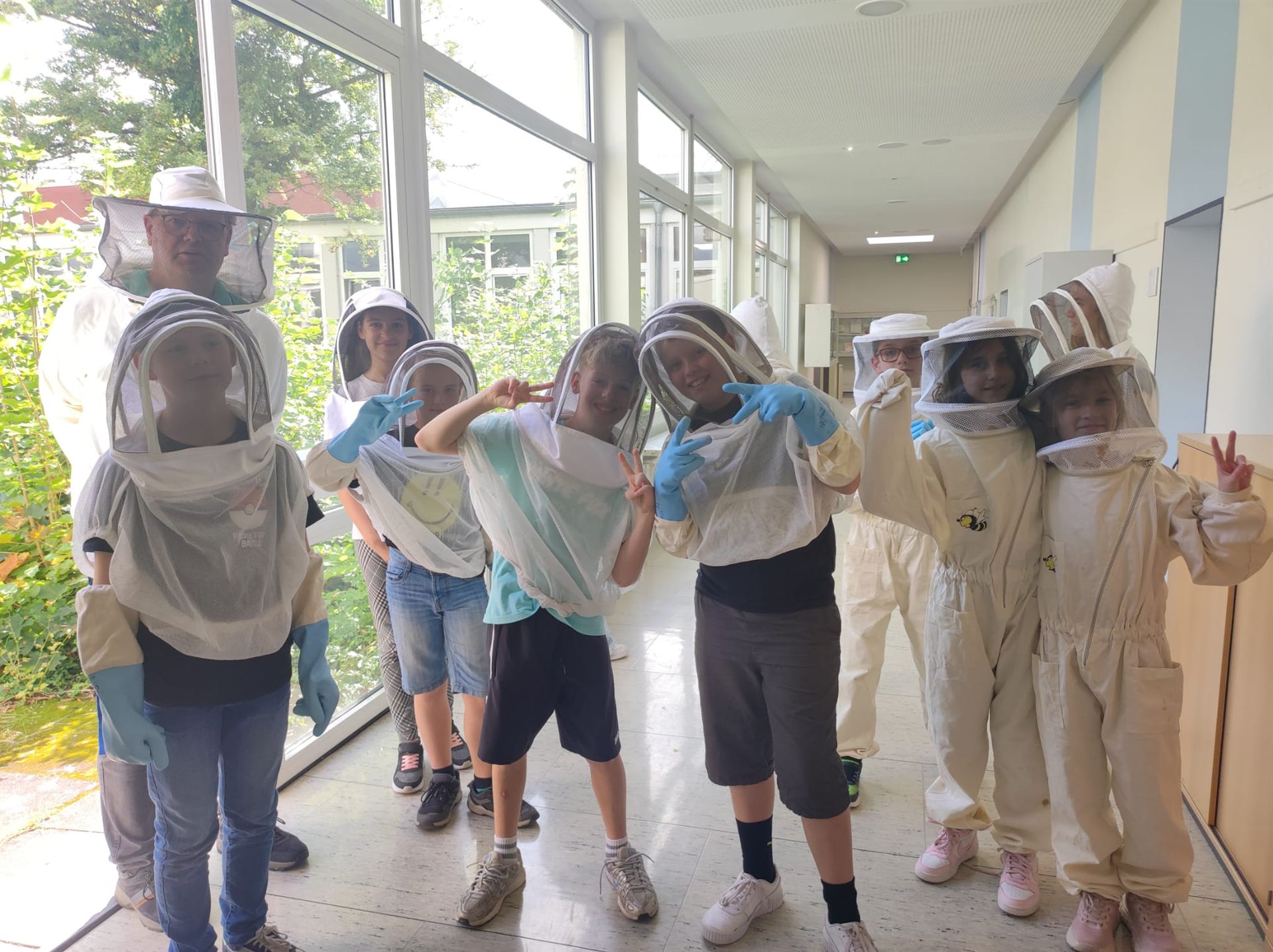 Der Bestand an Insekten ist in den letzten 30 Jahren um bis zu 75% gesunken. Mit diesem Artensterben, ihren Ursachen und Auswirkungen beschäftigten sich die sechsten Klassen im Rahmen des Biologieunterrichts. Die Schülerinnen und Schüler erkundeten auf einer Exkursion die insektenfreundlichen Bereiche unseres Schulhofs. Mit den Tablets bestimmten sie viele heimische Blühpflanzen, Büsche und Bäume, die die Artenvielfalt fördern. Auch unsere Insektenhotels wurden besichtigt und ihre Funktion erläutert. Der Höhepunkt war der Besuch der Schulbienen mit Herrn Böker, der den Kids alle Fragen zum Bienenvolk beantwortete.