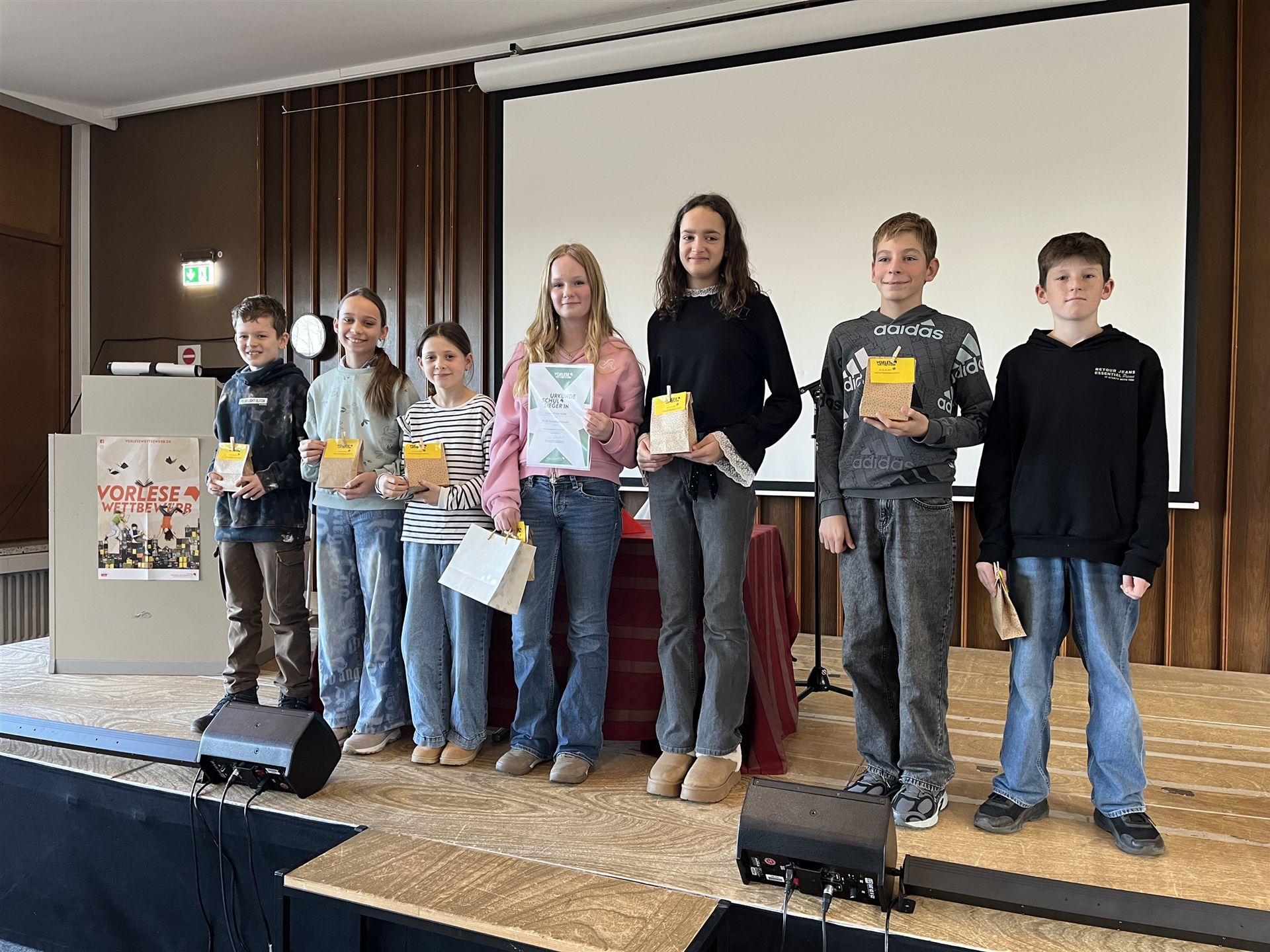 Mit großer Begeisterung lauschten am Montag, den 1.12.2025 alle Schüler*innen des 6. Jahrgangs in der Aula „ihren“ Klassensieger*innen (Vivian Felia Nolte (6H1), Jeremie Fuchs (6H2), Darian Dietrich (6R1), Alara Hofmeister (6R2), Leo Kellner (6G1)), als diese beim Vorlesewettbewerb zunächst einige Seiten aus ihrem selbst gewählten Buch und im zweiten Durchgang aus einem unbekannten Buch vorlasen.