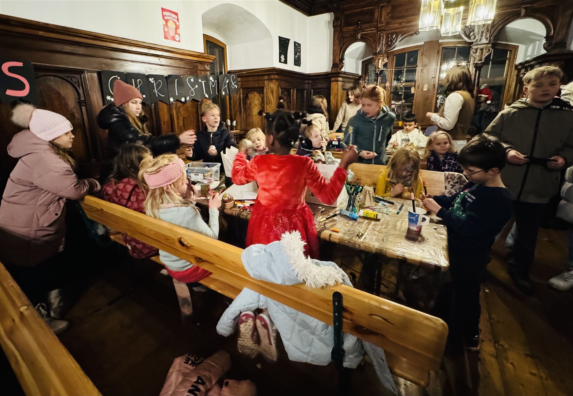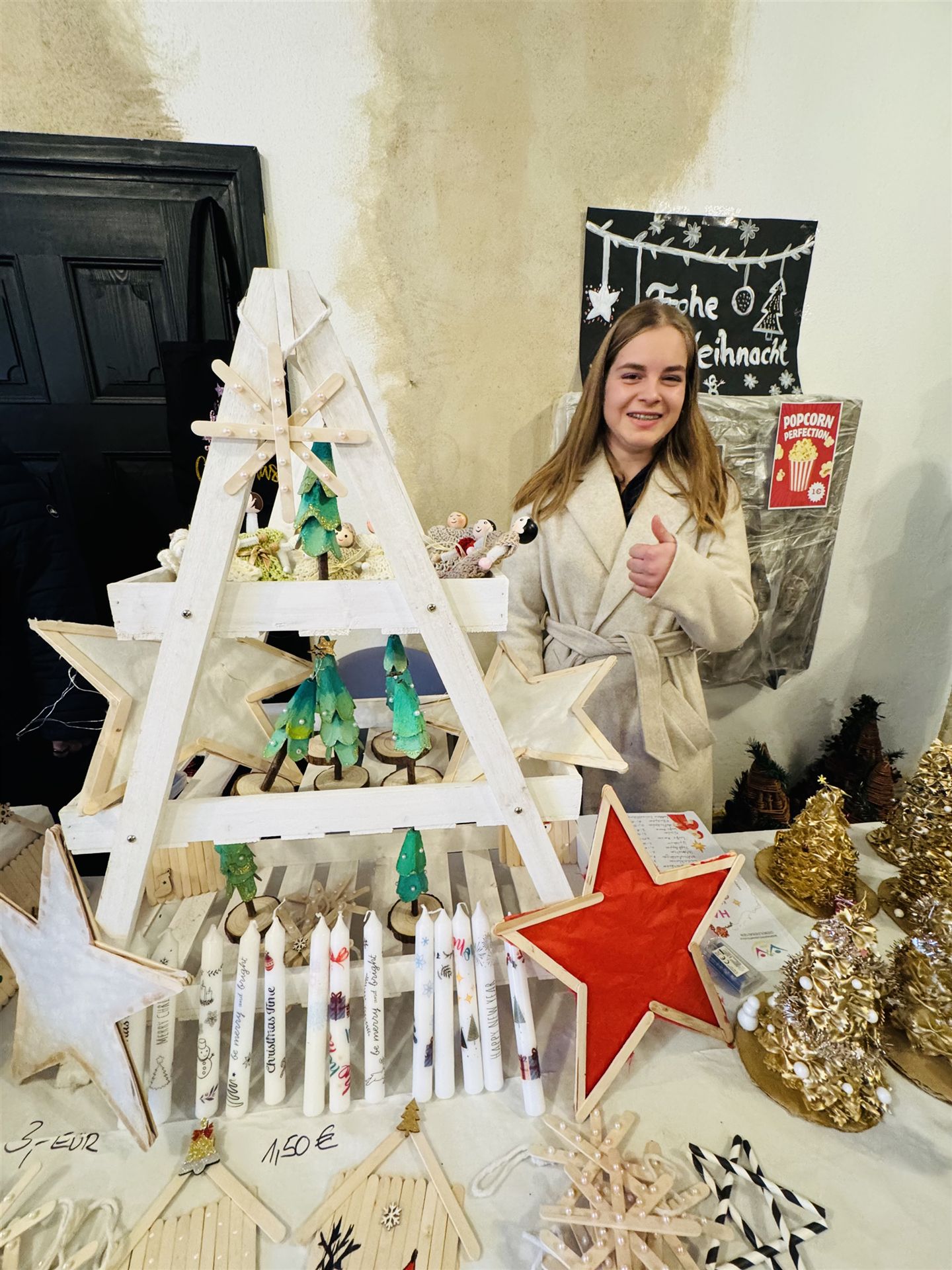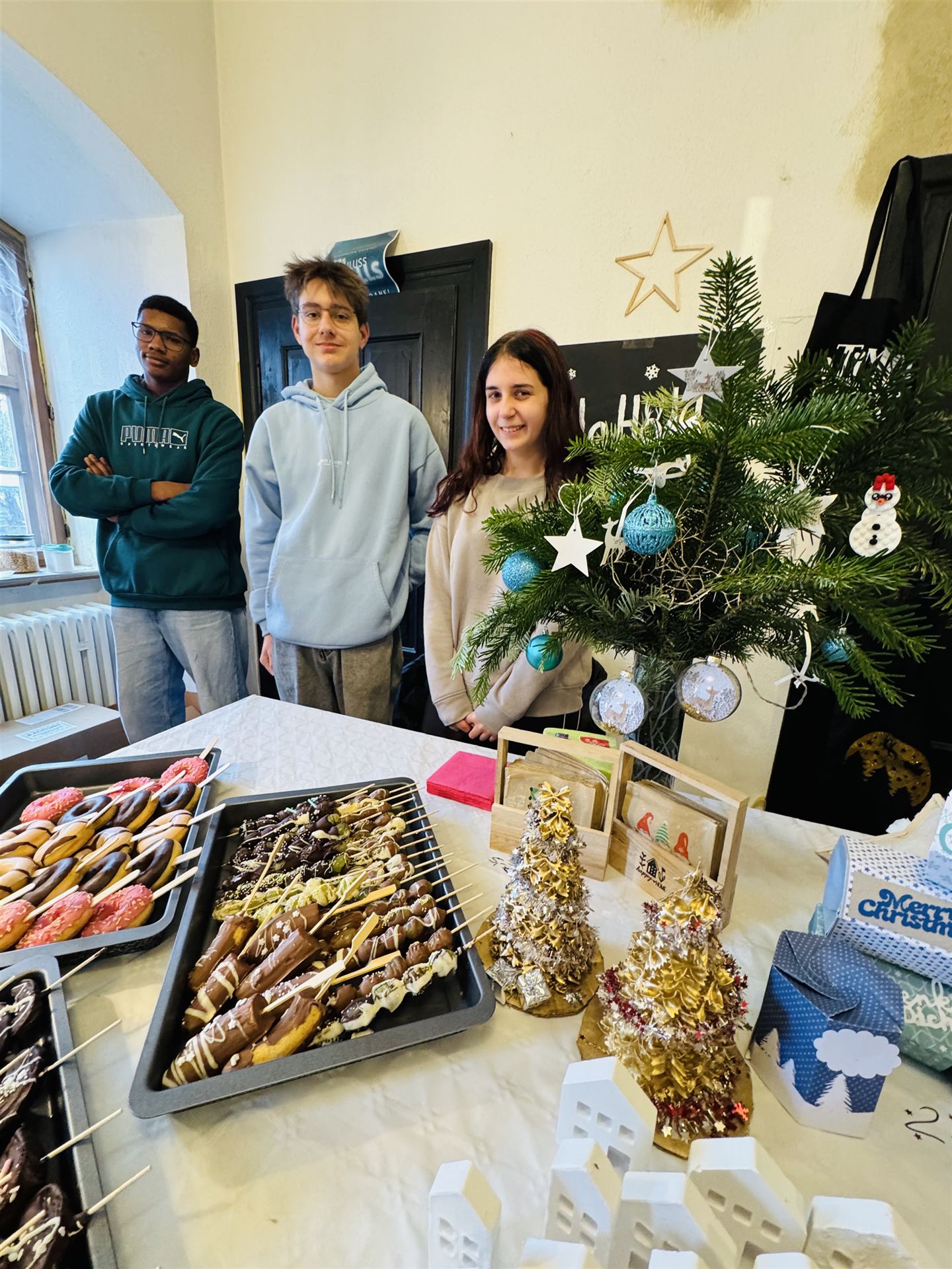 Die Abschlussklassen boten unter der Leitung von Frau Jonas selbstgemachtes Popcorn, Bastelerzeugnisse aus dem Unterricht sowie köstliche Schokofrüchte, die in den Hauswirtschaftskursen hergestellt worden waren, zum Verkauf an. Mit großem Engagement betreuten die Schülerinnen und Schüler ihre Stände und trugen so wesentlich zur lebendigen Marktstimmung bei.