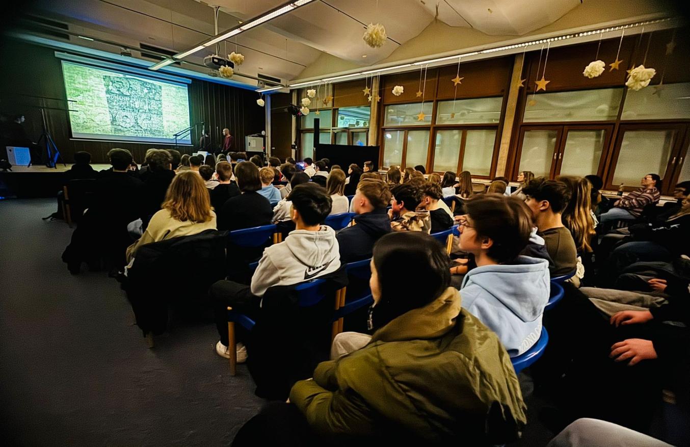 Beim diesjährigen Profilabend präsentierte die Klasse 9G1 eindrucksvoll die Ergebnisse ihrer Arbeit aus dem BNE-Unterricht. Im Mittelpunkt standen vier selbst produzierte Kurzfilme, die sich inhaltlich mit den Sustainable Development Goals (SDGs) beschäftigten und die Frage stellten, wie ein gutes Leben für alle weltweit gelingen kann. Die Filme wurden mit professionellem Equipment vorbereitet, gefilmt und geschnitten. Unterstützt wurden die Schülerinnen und Schüler dabei sowohl von Inhaltsprofis als auch von Filmprofis, die sie während des gesamten Produktionsprozesses begleiteten. Die fertigen Kurzfilme wurden in der Aula präsentiert und stießen beim Publikum auf großes Interesse. Im Anschluss moderierten die Neuntklässlerinnen und Neuntklässler souverän eine Diskussionsrunde mit dem Publikum, in der Inhalte, Botschaften und globale Zusammenhänge gemeinsam reflektiert wurden.