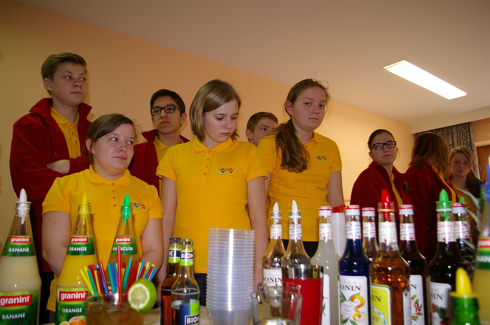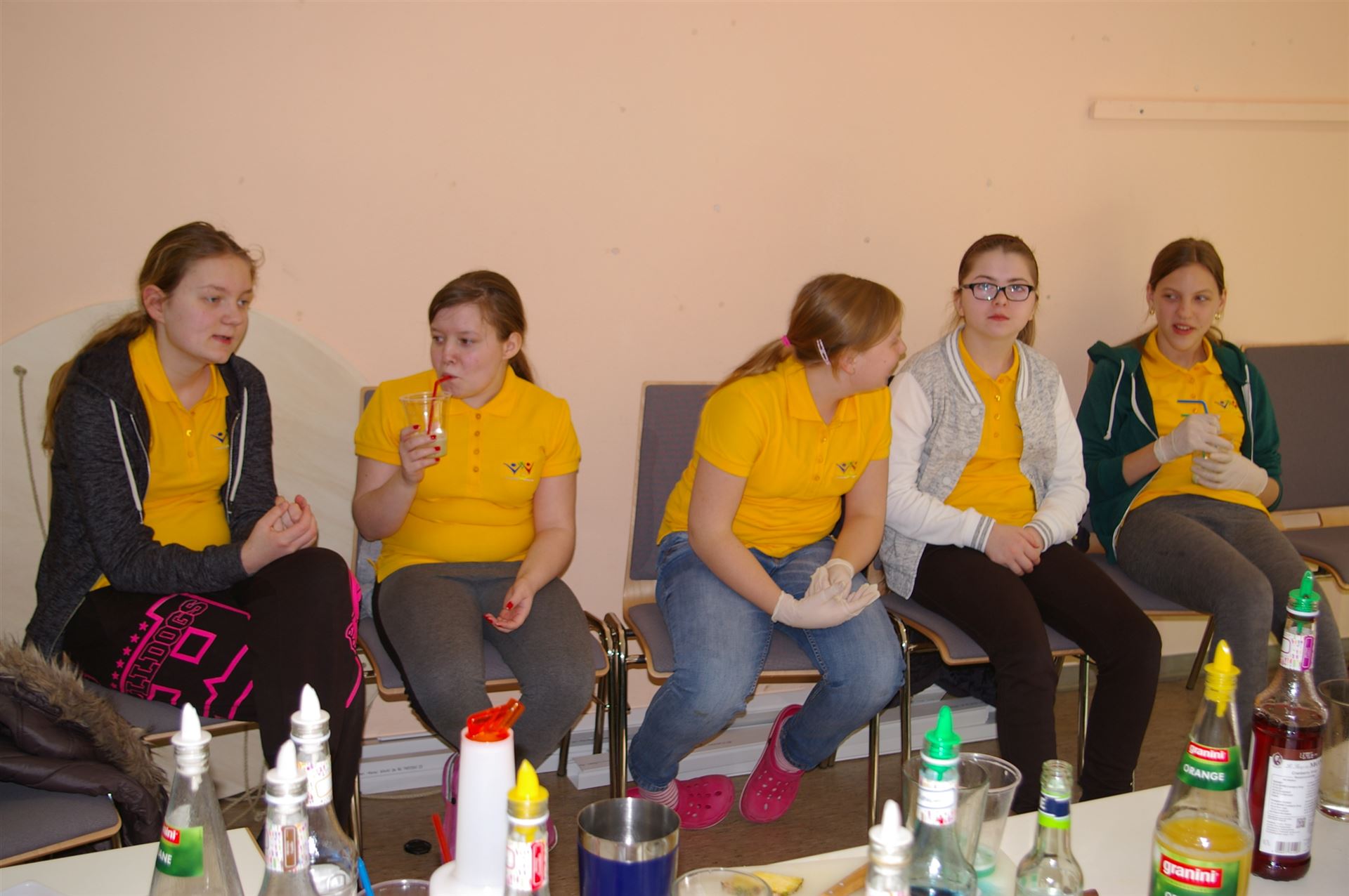 Am Wochenende vom 10.03. bis 12.03.2017 fand das ein Ausbildungswochenende unserer Wim!Bar statt. 15 Schülerinnen und Schüler aus den Jahrgängen 7 bis 10 nahmen daran teil. 6 Schülerinnen aus dem 7. Jahrgang waren als neue Wim!Keeper mit dabei. Die Ausbildung fand wie in den letzten Jahren auch in Gerblingerode, im Ferienparadies Pferdeberg, statt. Teambildung, Information zum Jugendschutzgesetz, Umgang mit Kunden, Gesundheit und Alkohol und natürlich das Erstellen von Cocktails standen auf dem Plan. Am Samstagabend war dann auch schon die erste Veranstaltung der Neuen: Freunde und Bekannte, Eltern und Geschwister, Interessierte waren eingeladen und durften unsere Cocktails genießen. Dabei waren auch neue Cocktail-Kreationen, die von den erfahrenen Wim!Keepern ausgesucht und auch kritisch getestet worden waren. Diese neuen Cocktails sollen dann ins Angebot der Wim!Bar aufgenommen werden. Am Sonntag wurden dann Melina, Saskia, Linda, Johanna, Lisa und Kristina offiziell ins Wim!Keeper-Team aufgenommen.