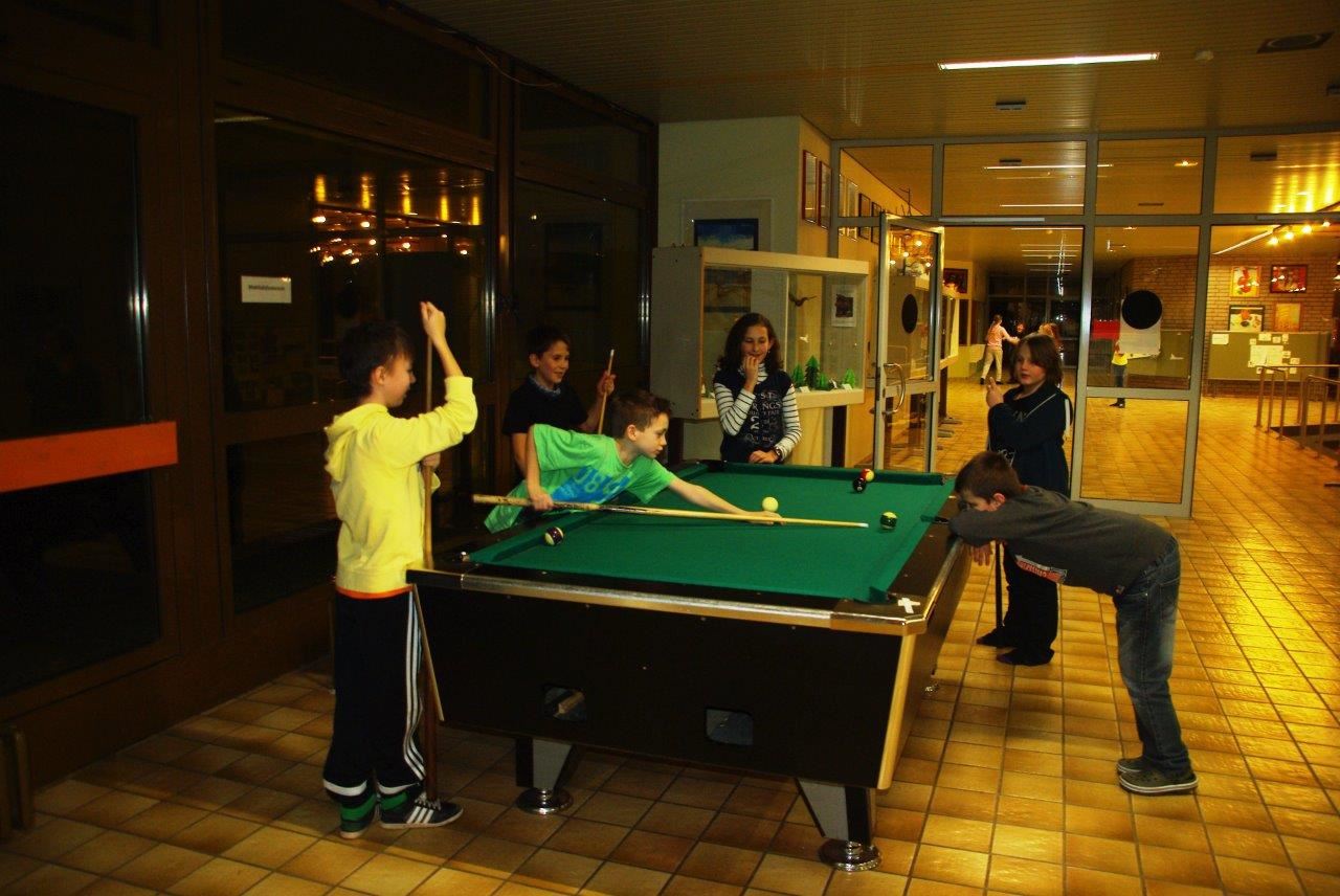 Um 19:30 Uhr wurde die Autorin Frau Schreier empfangen. Sie war einigen Kindern schon aus der Grundschule bekannt. Im Gepäck hatte sie ihr noch unveröffentlichtes, neues Buch. Das Besondere an diesem Buch ist: Sie hat Schüler aus der 5e, die in der 4.Klasse eine Klassenfahrt nach Bleicherode unternommen haben, als Helden in die Geschichte eingearbeitet und so fanden sich Lara und Eileen und einige andere Mitschüler in der Geschichte wieder, wie sie sich tapfer den untoten Raubrittern entgegenstellten und schließlich mit Hilfe des Schneckenhengstritters in die Flucht schlugen. Gebannt hörten sie der Autorin zu und man konnte die beschriebene Spannung im Unterholz und das Knacken der Äste spüren und hören. In der anschließenden freien Zeit wurde das Abenteuer von einigen Kindern nachgespielt, andere lasen oder spielten Billard.