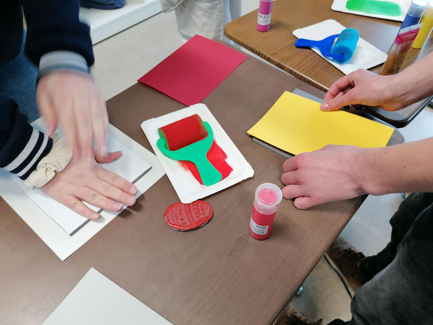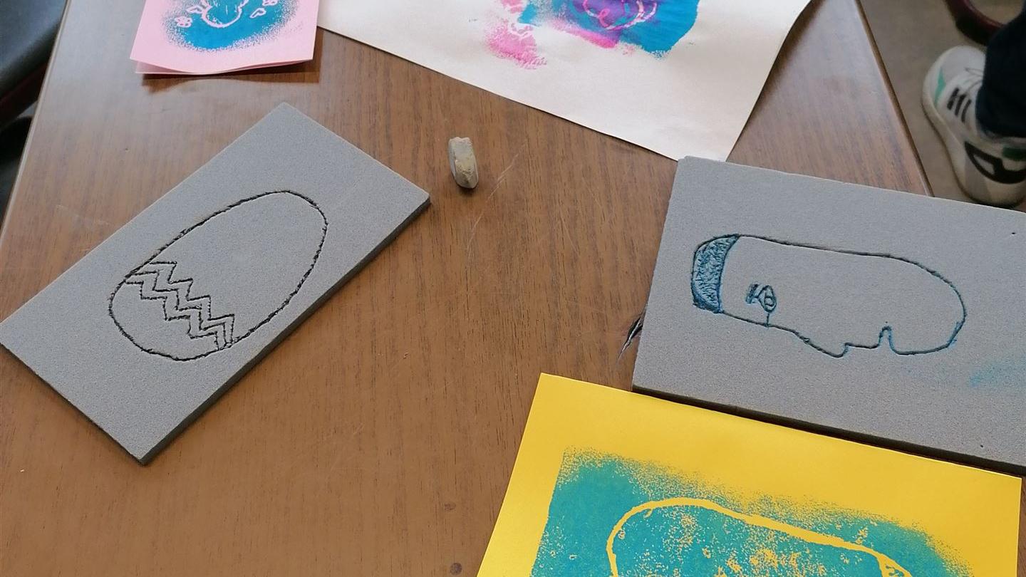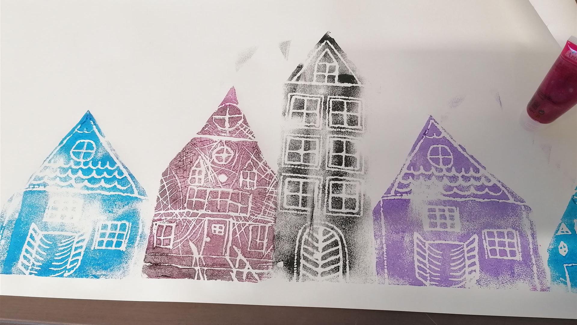 Zum Thema „Druckverfahren“ (hier: Hochdruck) hat die 8G1 aus Dämmplatten Druckvorlagen hergestellt. Damit haben die Schülerinnen und Schüler zunächst Einzelbilder gedruckt (z.B. Ein-Linien-Bilder nach Paul Klee). Später folgte dann ein Gemeinschaftsbild: Die imposante Häuserreihe wächst stetig weiter.