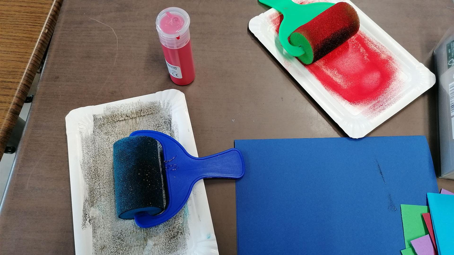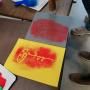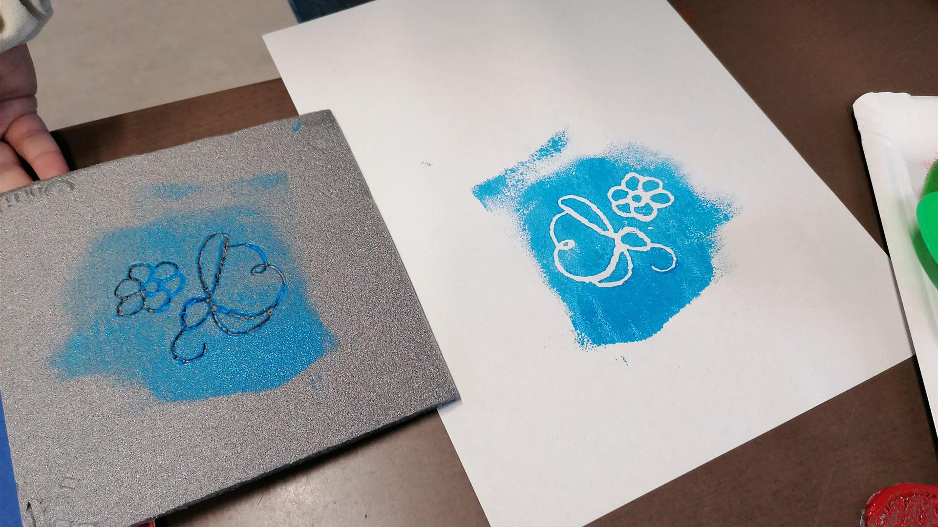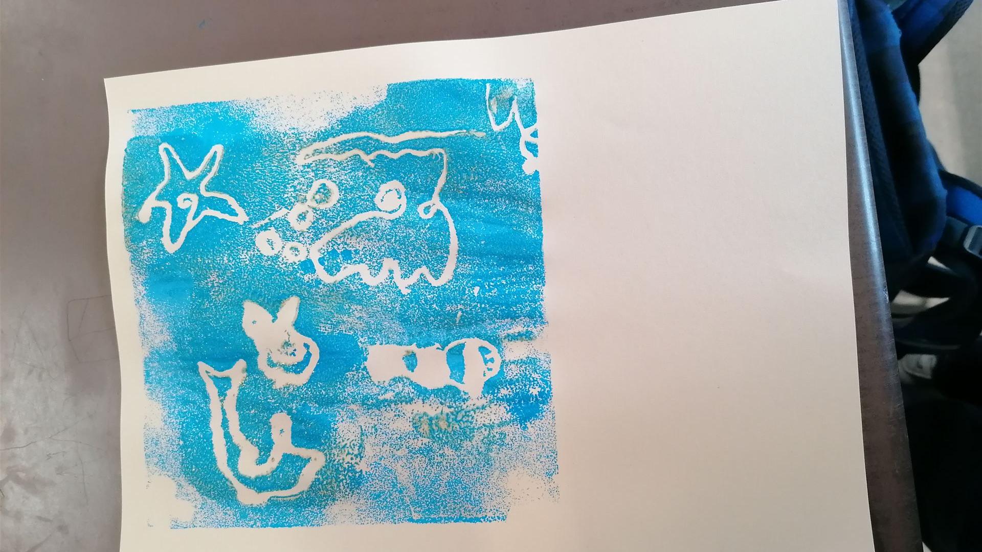 Zum Thema „Druckverfahren“ (hier: Hochdruck) hat die 8G1 aus Dämmplatten Druckvorlagen hergestellt. Damit haben die Schülerinnen und Schüler zunächst Einzelbilder gedruckt (z.B. Ein-Linien-Bilder nach Paul Klee). Später folgte dann ein Gemeinschaftsbild: Die imposante Häuserreihe wächst stetig weiter.